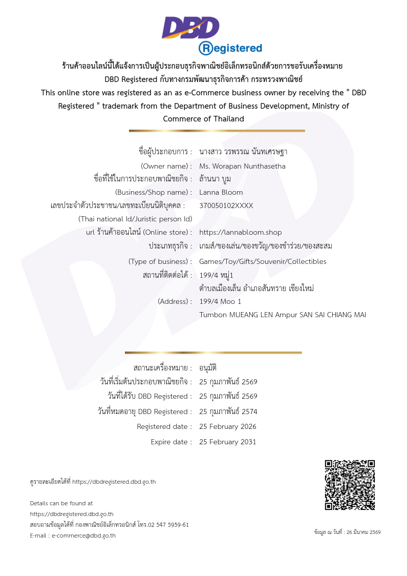 Lanna Bloom is a DBD Verified online business in Thailand (Department of Business Development, Ministry of Commerce). This verification supports transparency and customer trust for online orders.